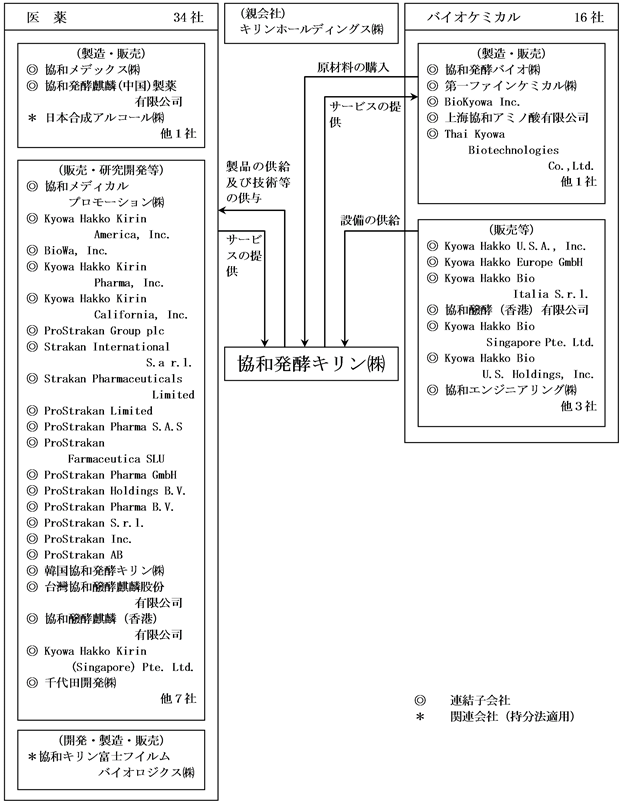 医療用医薬品は、主として当社が製造及び販売を行っており、臨床検査試薬は、協和メデックス㈱が製造及び販売を行っております。協和メディカルプロモーション㈱は当社製品の販売促進活動を行っております。また、協和キリン富士フイルムバイオロジクス㈱はバイオシミラー医薬品の開発を行っており、今後、製造及び販売も行う予定であります。