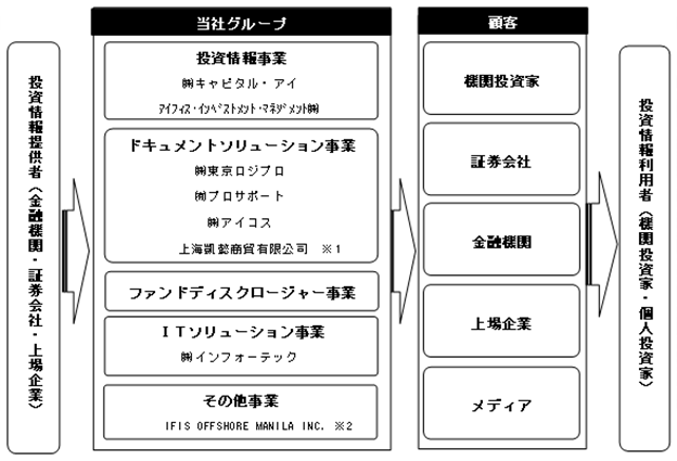 Section titled “3【事業の内容】”当社グループ(当社及び当社の関係会社)は、当社と子会社7社、関連会社1社から構成されております。当社は創業以来、証券調査レポートに関連する「電子媒体」と「紙媒体」の両方でのサービスを提供することで、ユニークな金融情報ベンダーとしての地位を築き上げてきました。その後、上場企業および投資信託のディスクロージャーといった会社法・金融商品取引法関連の金融・財務ドキュメント分野でのサービスも開始いたしました。現在、証券会社、機関投資家、上場企業などにご利用いただいており、ウェブ、E-mail、Fax、動画、印刷などのあらゆる情報伝達媒体をカバーした情報提供・情報処理サービス事業を展開しております。