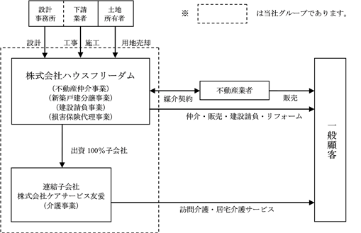 Section titled “3【事業の内容】”当社グループ(当社及び当社の関係会社)は、当社(株式会社ハウスフリーダム)及び100%子会社である株式会社ケアサービス友愛の2社で構成されております。