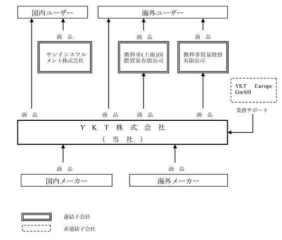 Section titled “3【事業の内容】”当社グループは当社(YKT株式会社)と連結子会社3社及び非連結子会社1社で構成され、電子機器及び工作機械、測定機器等の設備機械の販売、ならびにそれらの取引に関連する保守・サービス等を中心に事業活動を行っております。