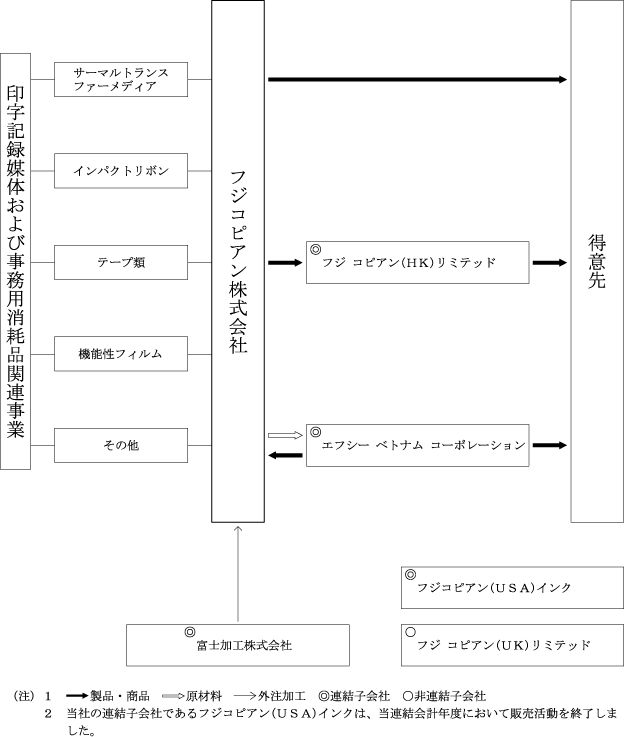 | 印字記録媒体および事務用消耗品関連事業 | サーマルトランスファーメディア | サーマルリボン、サーマルカーボンコピー | 製造 | 富士加工株式会社 |