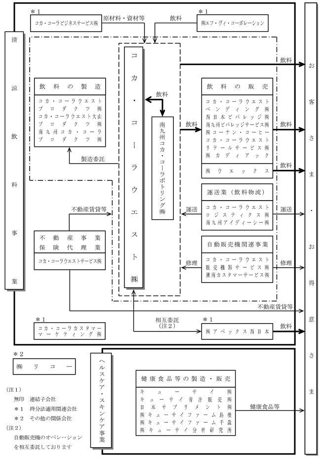 | 平成22年1月 | 営業・販売事業を営む子会社3社を事業別に再編し、ウエストベンディング株式会社(現、コカ・コーラウエストベンディング株式会社)、西日本ビバレッジ株式会社、およびコカ・コーラウエストリテールサービス株式会社(現、コカ・コーラウエストセールスサポート株式会社)を発足 |