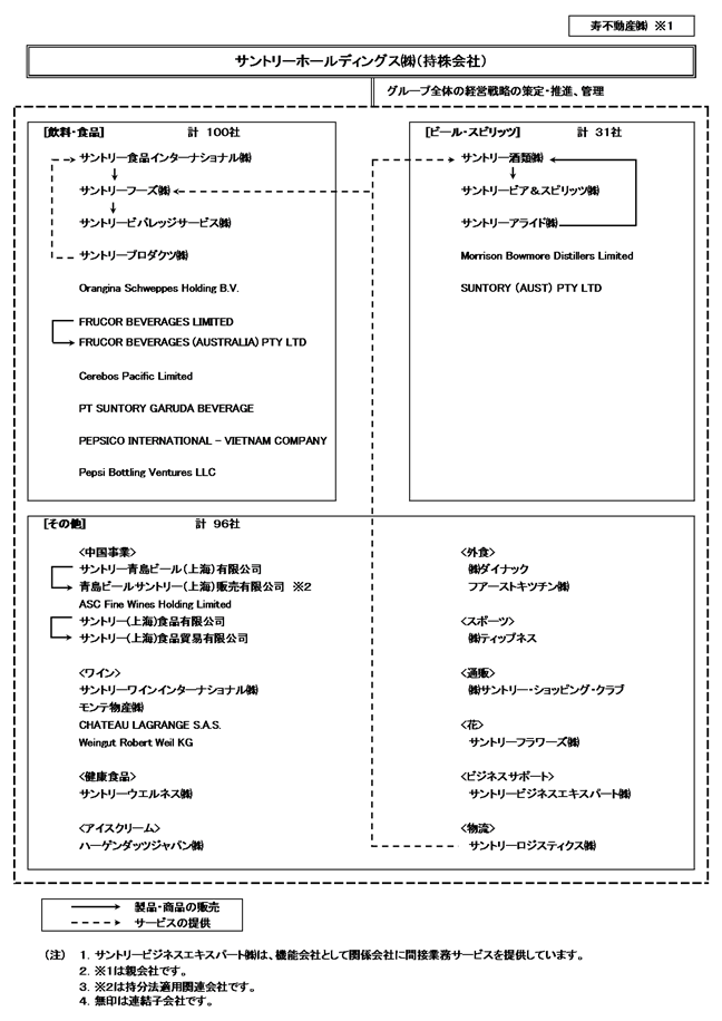 サントリー食品インターナショナル㈱は、清涼飲料の製造・販売を行っています。サントリーフーズ㈱は、サントリー食品インターナショナル㈱が製造する清涼飲料の販売を行っています。サントリービバレッジサービス㈱は、主として自動販売機チャネルでサントリー食品インターナショナル㈱が製造する清涼飲料の販売を行っています。サントリープロダクツ㈱は、サントリー食品インターナショナル㈱より清涼飲料の製造を受託しています。
