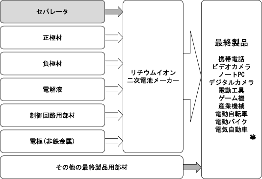リチウムイオン二次電池用セパレータの最終製品への流れは、以下のとおりであります。