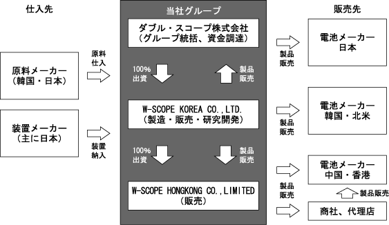 当社グループの製品の製造は、連結子会社W-SCOPE KOREA CO.,LTD.に集約しております。当社グループでは当社にて日本、北米、ヨーロッパ市場及びグループ全体での営業活動を統括し、連結子会社のW-SCOPE KOREA CO.,LTD.にて韓国及び台湾市場を、W-SCOPE KOREA CO.,LTD.の連結子会社W-SCOPE HONGKONG CO.,LIMITEDにて中国、香港市場への営業活動を展開しております。また、当社グループの研究開発活動は、主にW-SCOPE KOREA CO.,LTD.の開発部門にて行っており、高耐熱セパレータの開発に取り組んでおります。