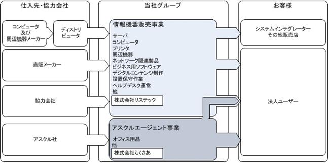 Section titled “3【事業の内容】”当社グループ(当社及び当社の関係会社)は、当社及び連結子会社2社の計3社で構成され、情報機器販売事業、アスクルエージェント事業を主たる業務としております。当社グループの事業内容は次のとおりであります。