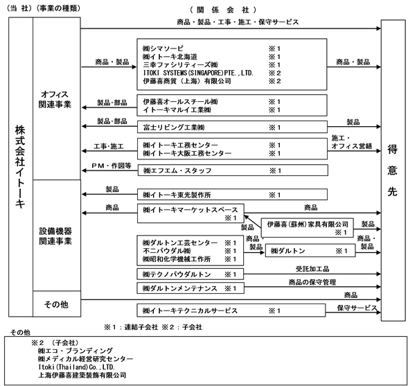 当社が得意先に直接、製造販売するほか、伊藤喜オールスチール㈱(連結子会社)、富士リビング工業㈱(連結子会社)、イトーキマルイ工業㈱(連結子会社)が製造し、㈱シマソービ(連結子会社)、㈱イトーキ北海道(連結子会社)、三幸ファシリティーズ㈱(連結子会社)や全国の代理店等を通して販売しており、東南アジアへはITOKI SYSTEMS(SINGAPORE)PTE.,LTD.(非連結子会社)、中国へは伊藤喜商貿(上海)有限公司(非連結子会社)を通じて販売しております。