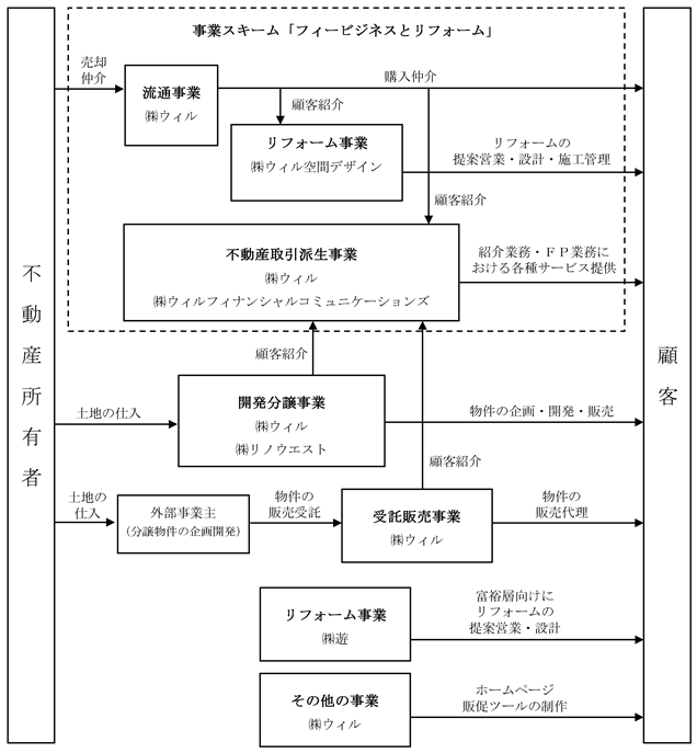 当社、株式会社ウィル空間デザイン及び株式会社遊において、中古住宅のリフォーム提案及びリフォーム工事等の請負業務を行っております。特に、流通事業各店舗に来店された顧客に対し、中古物件購入とリフォームを併せた提案営業を推進しております。