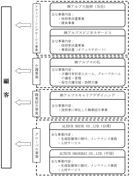 Section titled “3【事業の内容】”当社グループ(当社及び当社の関係会社)は、当社(株式会社アルプス技研)及び子会社5社から構成されており、当社グループの事業は、アウトソーシングサービス事業、介護事業、職業紹介事業、グローバル事業の4事業を行っております。