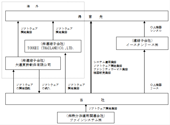 Section titled “3【事業の内容】”当社グループ(当社及び当社の関係会社)は、㈱東計電算(当社)、子会社3社並びに関連会社1社により構成され、情報処理・ソフトウェア開発業務(ソフトウェア開発業務・システム運用業務・ファシリティサービス業務)、機器販売業務、リース等その他の業務を営んでおります。