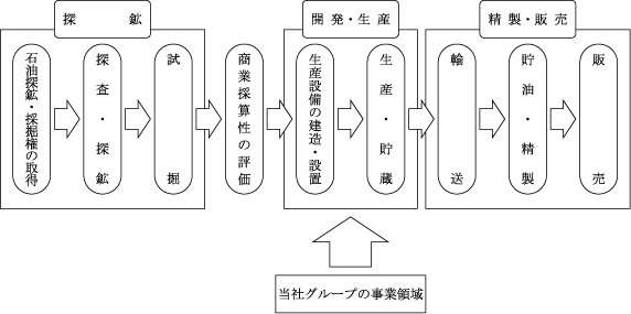 Section titled “(1) 当社グループの事業分野”石油開発事業は、油田の探鉱から始まって開発・生産、精製・販売といった過程に大きく分けられます。石油開発事業は一般的に、比較的リスクが高いビジネスですが、リスクの高い分野は鉱業権・石油権益取得から試掘までの探鉱の分野であり、当社グループが関わる開発・生産の分野は、石油開発事業者において商業採算性の評価が得られた後に開始される事業であります。