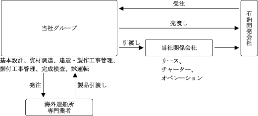 オイルメジャーに代表される石油開発事業者は、かつてはこうした事業に用いる設備等を自らが建造して所有し、かつ一連のプロセスを直轄しておりましたが、近年では専業会社にアウトソーシングする流れにあります。当社グループは石油開発業界におけるこのような趨勢のもと、海外各国の政府系又は民間石油開発事業者の開発計画に応じたFPSOをはじめとする浮体式海洋石油・ガス生産設備について、次のようなトータルサービスを提供しております。