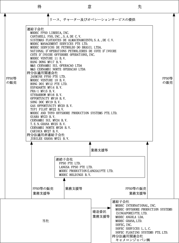 Section titled “3 【事業の内容】”当社グループは、当社、子会社27社(MODEC INTERNATIONAL,INC.他26社)及び関連会社17社(JASMINE FPSO PTE LTD. 他16社)で構成され、FPSO、FSO及びTLPといった浮体式海洋石油・ガス生産設備の設計・建造・据付、販売、リース及びオペレーションを主な事業としております。主な得意先は海外各国の政府系又は民間石油開発会社であり、当社グループは浮体式海洋石油・ガス生産設備について、次のようなトータルサービスを提供しております。