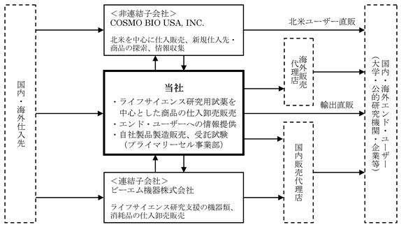 Section titled “3【事業の内容】”当社グループ(当社及び当社の関係会社)は、当社(コスモ・バイオ株式会社)、連結子会社1社及び非連結子会社1社で構成されており、ライフサイエンス関連研究用試薬、機器、受託サービス及び臨床検査薬の仕入販売を主たる業務としております。