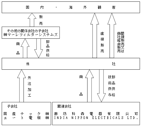 | 電装品 モータ | ・・・ | 国内顧客向け販売の大部分は当社直販で行っており、海外顧客向け販売の大部分は商社を通じて行っております。製造は、当社とその子会社、関連会社が主として加工組立を行っております。 |