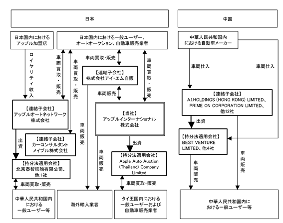 Section titled “3【事業の内容】”当社グループ(当社及び当社の関係会社)は、当社(アップルインターナショナル株式会社)、重要な子会社2社(アップルオートネットワーク株式会社、A.I.HOLDINGS (HONG KONG) LIMITED)を含む連結子会社17社により構成されており、日本、中国において自動車の販売並びに仕入及び買取を行っております。