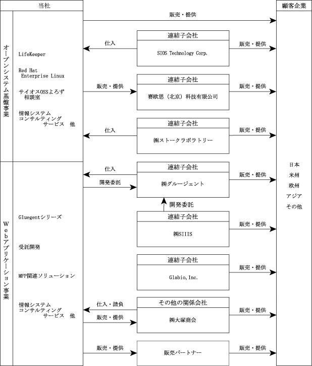 Section titled “3 【事業の内容】”当社グループは、当社、連結子会社6社で構成されており、オープンソースソフトウェア(*1)(以下、OSS)を軸に、WebアプリケーションやOS(基本ソフトウェア)、ITシステムの開発/基盤構築/運用サポート等の事業を展開し、現在はこれらにクラウドコンピューティング(*2)(以下、クラウド)技術を加え、新たな価値創造とその提供に取り組んでいます。