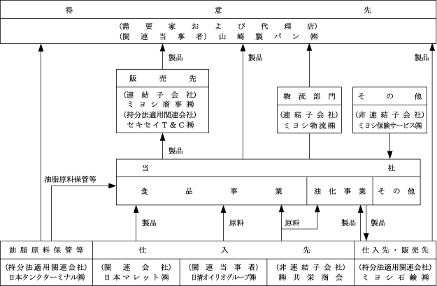 | 食品事業 | 食用油脂は、当社が製造し、需要家および代理店に販売しております。この代理店に連結子会社のミヨシ商事㈱が含まれております。 関連当事者(主要株主)の山崎製パン㈱に、代理店を経由し製品を販売しております。また、関連当事者(主要株主)の日清オイリオグループ㈱より、主に商社等の代理店を経由して油脂原料を購入しております。 関連会社の日本マレット㈱は、当社が海外技術導入に際し締結した合弁事業契約に基づき設立したものであります。 |