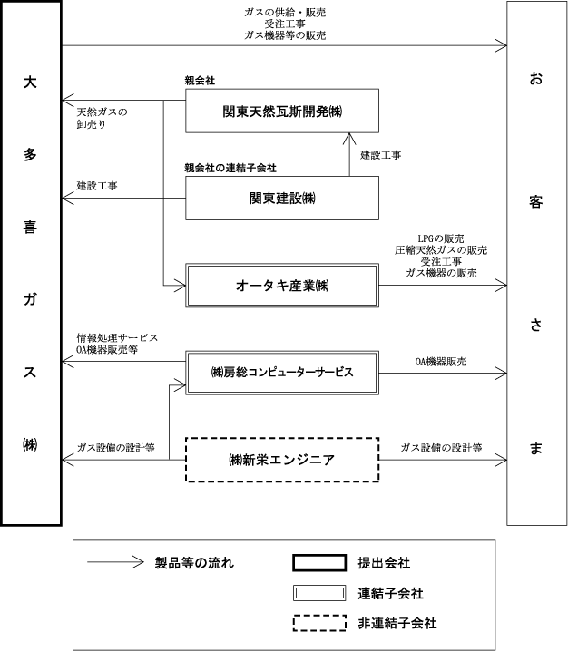 Section titled “(1) ガス”関東天然瓦斯開発株式会社(当社の親会社)は、千葉県において天然ガスを生産し、当社を含むガス事業者及びオータキ産業株式会社(当社の連結子会社)等に対し、天然ガスの卸売り等を行っております。当社は、関東天然瓦斯開発株式会社及び他社から仕入れたガスを、導管を通じて販売しております。また、ガスの販売に係わるお客さま負担の内管工事やガス機器の販売等を行っております。