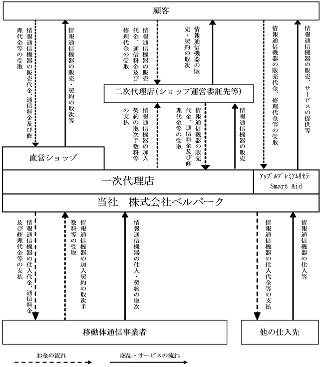 なお、二次代理店に再委託しているキャリア認定ショップ(フランチャイズ店)においても直営店と同様の事業が行われており、併売店においては情報通信機器の通信サービスの新規契約及び機種変更契約等加入の獲得、情報通信機器等商品の販売等に限った事業が行われております。