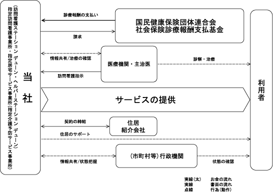 訪問看護とは、精神疾患等の疾病を抱えながら生活している方で本人が希望し、主治医が訪問看護を必要と認め、主治医から指示書が処方された人に対して、国家資格若しくは都道府県知事資格免許をもった看護師・准看護師及び保健師等が在宅で療養上の世話または必要な診療の補助を行なう行為であり、いかにその人らしい生活、人生を送れるかということをサポートしていくものであります。当社は、サポートを行うことにより、訪問看護料を得ております。訪問看護料は、国民健康保険団体連合会、社会保険診療報酬支払基金より支払われる診療報酬及び利用者からの自己負担金で構成されております。