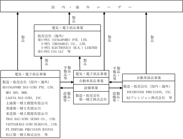 ※過年度において、創業者一族は事業目的別に会社を設立して事業を展開しておりましたが、平成11年10月から平成12年4月にかけてそれらの事業を当社に集約しております。㈱ダイイチパーツ(平成元年10月設立、事業目的はコネクタ事業の管理会社)、㈱ダイイチセミコン(平成元年10月設立、事業目的は半導体設備事業の管理会社)、誠巧技研㈱(昭和55年3月買収、事業目的は半導体製造装置の製造)、㈱ディステック(昭和54年5月設立、事業目的は金型・自動機等の設備製作)、㈱ディー・エム・シー(昭和59年7月設立、事業目的は電子・電装部品の量産生産)の5社は全て創業者一族所有の法人であります。