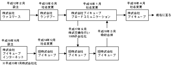 その後、株式会社ブイキューブブロードコミュニケーションは、平成17年9月に株式交換により旧株式会社ブイキューブを子会社化、平成18年3月に吸収合併し、同年4月に株式会社ブイキューブに商号変更しております。