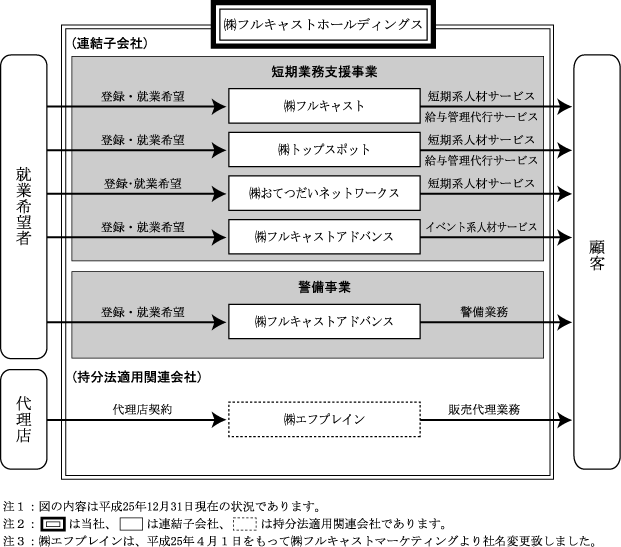 | ㈱フルキャストレディの営業の一部を吸収分割により承継。㈱フルキャストレディはオフィス系短期業務請負・派遣に特化し、㈱フルキャストオフィスサポート(現社名㈱フルキャスト(現・連結子会社))に改称。 | |