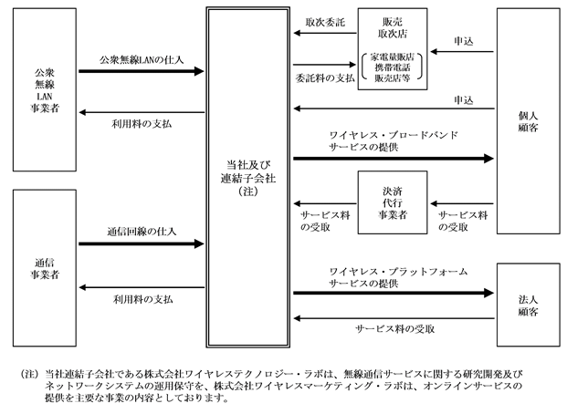 当社グループでは、複数の公衆無線LAN事業者(注1)のWi-Fiスポット(注2)及び複数の通信事業者の通信網を用い、ユーザーのニーズに応じた無線通信サービスを、主に家電量販店や携帯電話販売店等を通じて提供しております。