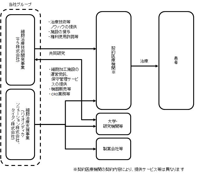 Section titled “3 【事業の内容】”当社グループは、当社及び連結子会社2社の計3社で構成されており、「医・療・を・創・る」をミッションとして、樹状細胞ワクチン療法を中心とした研究開発、全国の医療機関に対する営業開拓、セミナー等を通じた患者に対する情報提供、学会等での発表を中心とした学術活動、及び主に大学医療機関に対する細胞加工施設の運営受託・保守管理サービス、機器販売等を継続的に行っております。報告セグメントは、樹状細胞ワクチン療法を中心とした独自の癌治療技術・ノウハウの提供を契約医療機関に行っている細胞治療技術開発事業、研究機関、医療機関からの細胞加工施設の運営受託及び保守管理サービス、及び消耗品、装置等の販売並びにCRO事業を行っている細胞治療支援事業の2つの区分で構成されております。