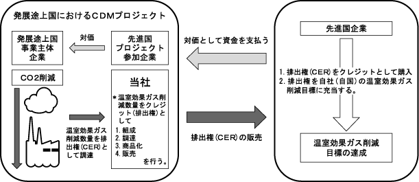 当社は、1992年に国連にて採択された「国連気候変動枠組条約」(注)1に従い1997年に締結された「京都議定書」(注)2及びこの議定書にて柔軟措置として定められた「京都メカニズム」(注)3に基づき、発展途上国にてクリーン開発メカニズム(以下「CDM」(”Clean Development Mechanism”)という。)(注)4として実施される温室効果ガス削減プロジェクトの発掘やこれにより組成されるクレジット(以下「CER」(”Certified Emission Reduction”)という。)(注)5に関連した以下の内容を主たる事業としております。