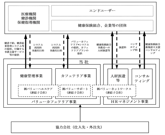 Section titled “3【事業の内容】”当社グループは、当社並びに連結子会社(㈱バリューサポート、㈱バリューネットワークス及び㈱バリューヘルスケア)の計4社で構成されており、「バリューカフェテリア事業」及び「HRマネジメント事業」を主な事業内容としております。