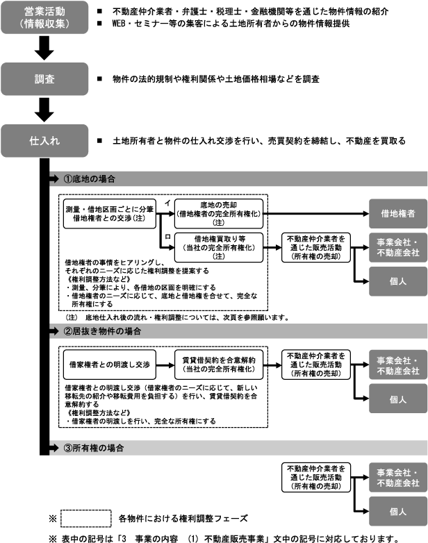 設立当初は、不動産の売買仲介及びマンション・アパ-ト・ビル等の賃貸、仲介事業のみでありましたが、業容の拡大に伴い「不動産販売事業」を開始いたしました。平成3年からは、一般的な不動産業者があまり取引対象としてこなかった底地の取扱いを開始し、現在では底地による収益が「不動産販売事業」の主要な部分を占めております。