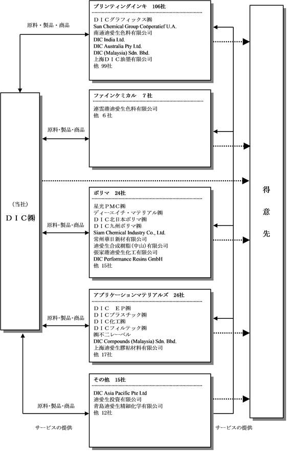 当社は、中期経営計画「DIC105」の開始に伴い、平成25年4月1日付でセグメント区分を変更した。下表は変更後のセグメント名称・区分によって記載している。なお、主要な関係会社における異動はない。