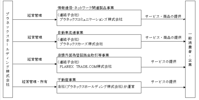 Section titled “3 【事業の内容】”当社グループ(当社および当社の関係会社)は、当社(プラネックスホールディング株式会社)を含めて、情報通信・ネットワーク関連事業、自動車流通事業、店頭外国為替証拠金取引等事業、当連結会計年度より新たに開始した不動産事業を営む計5社により構成されております。主要な製品・サービスの種類は以下のとおりであります。