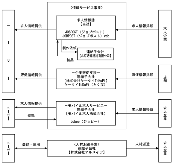 情報サービス事業は、①当社、②北京培繹諮詢有限公司(連結子会社)、③株式会社ケータイToKuPi(連結子会社)、④モバイル求人株式会社(連結子会社)の4社が営んでおります。本事業は〈求人情報誌部門〉、〈企業販促支援部門〉、〈モバイル求人サービス部門〉から構成されております。