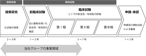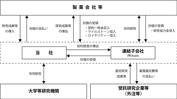 当社グループは、先端科学技術を活用し、医療分野においてニーズの高い疾患領域に対する新たな医薬品を生み出すことを目指す研究開発型の創薬企業であり、独自に創出した新薬の開発化合物(*)の知的財産権を製薬会社等に対して導出(使用許諾契約によりライセンスアウト)することにより収益を獲得することを事業展開の基本としております。