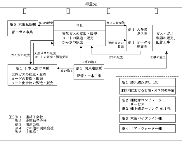 Section titled “3 【事業の内容】” 当社グループは、当社および子会社8社(連結子会社5社、非連結子会社3社)ならびに関連会社1社(平成25年12月31日現在)で構成されております。主な事業内容は、天然ガスの開発から需要家へのガスの供給までをグループ内で一貫して行うガス事業、天然ガスの生産に付随するかん水を利用したヨード・かん水事業であります。当社グループの営んでいる事業内容と各会社の位置付けは次のとおりであり、記載区分は事業の種類別セグメントと同一であります。