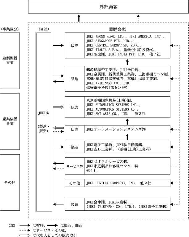 | 縫製機器事業 | 工業用ミシン 家庭用ミシン | 連結子会社 | 製品製造部品製造 | ㈱鈴民精密工業所、JUKI松江㈱、JUKI金属㈱、新興重機工業㈲、上海重機ミシン㈲、重機(寧波)精密機械㈲、重機(上海)工業㈲、JUKI(VIETNAM)CO., LTD. |