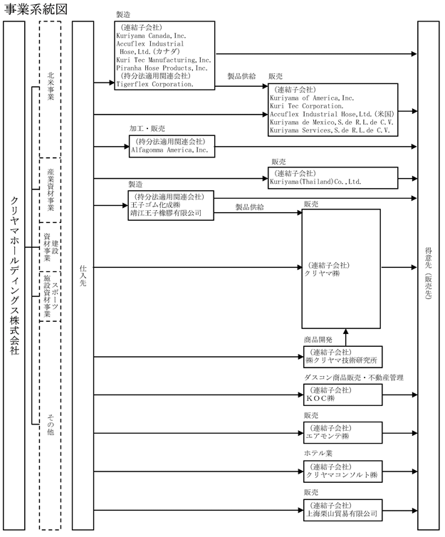 国内において、主に連結子会社クリヤマ㈱が油圧ショベル、ブルドーザーやトラクター等の建設用機械・農業用機械向け部材、船舶用床材、発電所向けライニング等のゴム・樹脂製品の販売並びに設置・施工を行っております。持分法適用関連会社王子ゴム化成㈱はゴム・樹脂製品等の製造販売を行っており、連結子会社クリヤマ㈱に商品を供給しております。また、持分法適用関連会社靖江王子橡膠有限公司は工業用ゴム・合成樹脂製品の製造販売を行い、その一部を上海栗山貿易有限公司に供給しております。