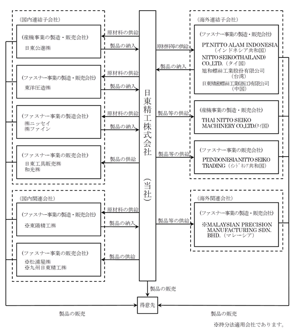 国内には、鋲螺類の製造・販売を行っている東洋圧造㈱、工業用ファスナーに使用される工具類の製造・販売を行っている東陽精工㈱、工業用ファスナーの製造工程の一部を受託している関係会社2社(㈱ニッセイ、他1社)、工業用ファスナーなどの販売を行う関係会社4社(和光㈱、他3社)があります。また、海外には、工業用ファスナーなどの製造・販売を行っている関係会社6社(旭和螺絲工業股份有限公司、PT.NITTO ALAM INDONESIA、他4社)などがあります。