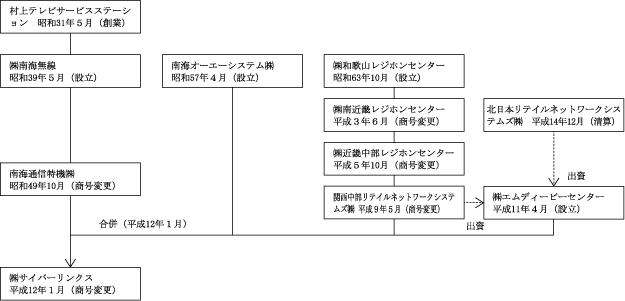 | 平成12年1月 | 南海通信特機㈱を存続会社として南海オーエーシステム㈱、関西中部リテイルネットワークシステムズ㈱及び㈱エムディービーセンターを吸収合併し、㈱サイバーリンクスに商号変更。東京支社(現東日本支社)及び大阪支社(現西日本支店)を設置。 |