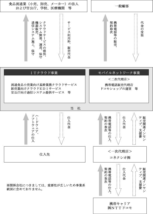 具体的には、食品流通業及び官公庁等の顧客向けに基幹業務システム等のクラウドサービスを提供する「ITクラウド事業」と、移動体通信機器の店舗販売を中心とする「モバイルネットワーク事業」を主な事業内容としております。