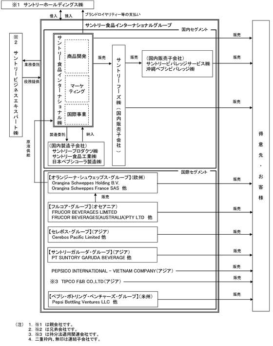 Section titled “3【事業の内容】”当社は、親会社であるサントリーホールディングス㈱を中心とするサントリーグループの飲料・食品セグメントの中核をなす企業で、飲料・食品の製造・販売事業を行っています。当社グループは、当社、子会社88社及び関連会社11社より構成されています。