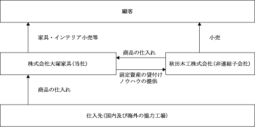 Section titled “3 【事業の内容】”当社グループ(当社及び当社の非連結子会社)は、株式会社大塚家具(当社)と、秋田木工株式会社(非連結子会社)の2社からなり、家具・インテリアの小売を主力事業としております。
